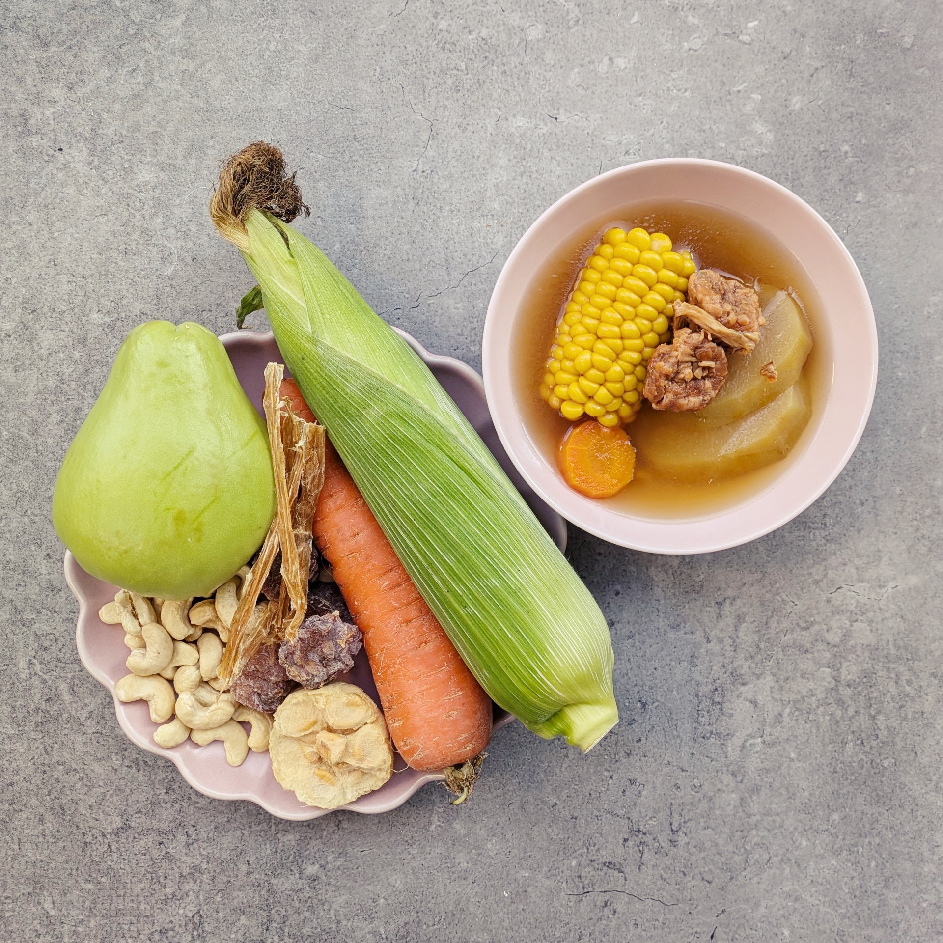 材料:🐚 日月魚4粒 + 🥒合掌瓜兩個 + 🌽 粟米一條 + 🥕紅蘿蔔一條 + 🥜 腰果20粒 + 🍈 羅漢甘果1/3 個