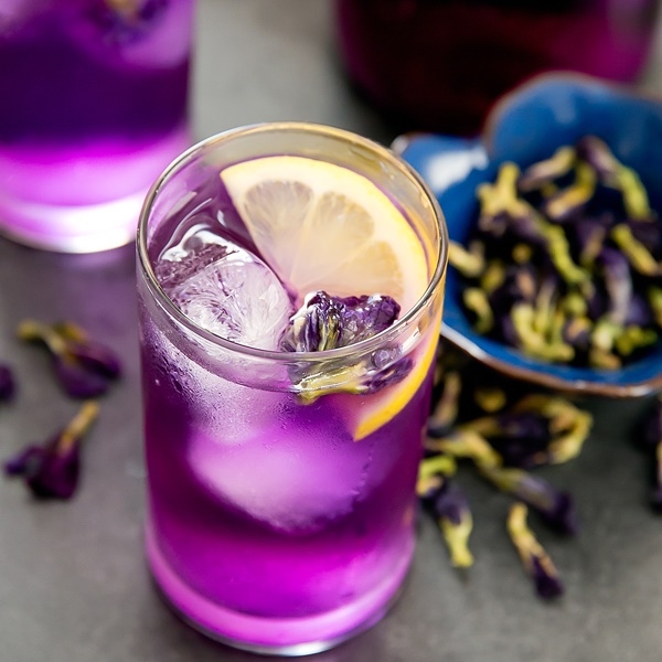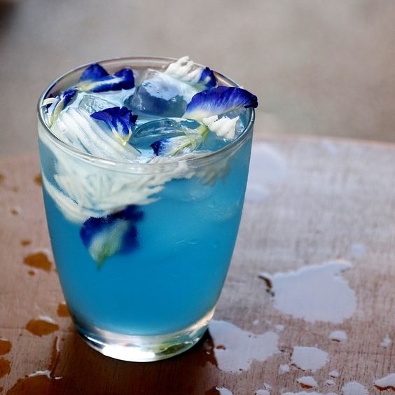 可依喜好加入其他茶飲、檸檬汁等調味搭配,泡好的蝶豆花茶呈鮮艷藍色,加入檸檬或是酒類,會對檸檬酸起反應,變成美麗的紫色。