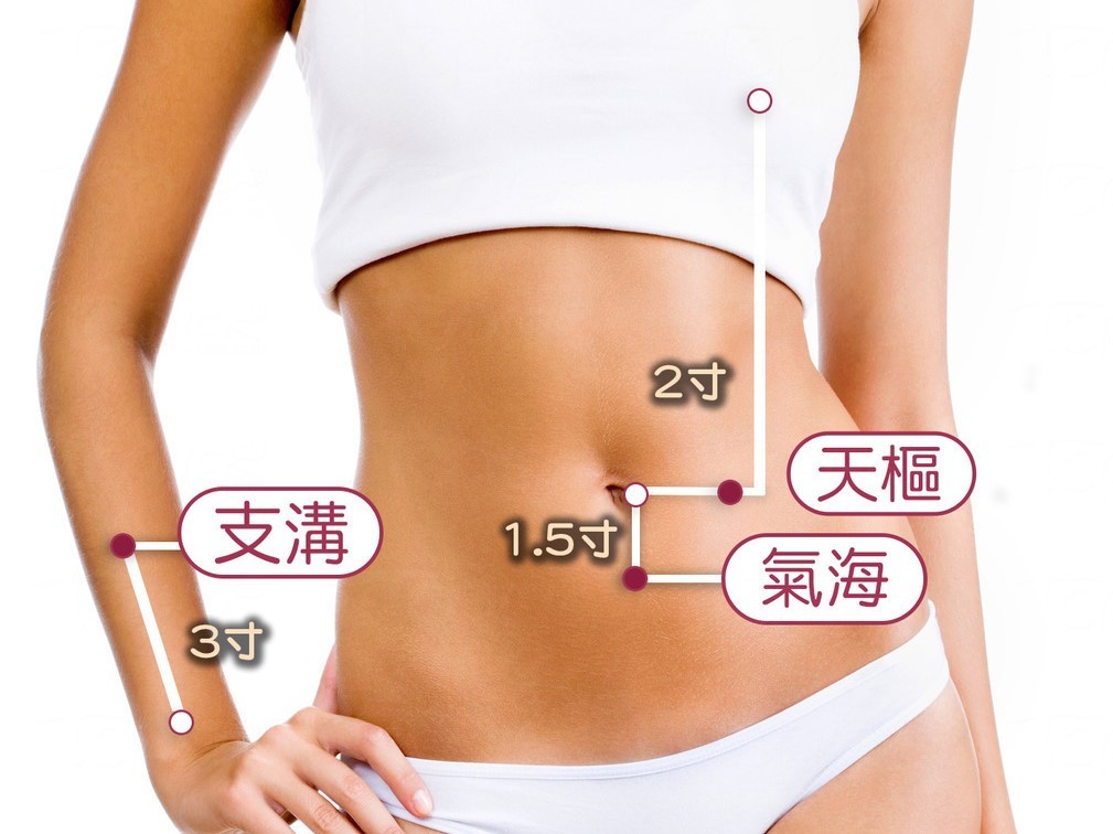 穴位位置:腹中部,臍中旁2寸(與乳頭同寬)。