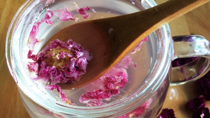 1. 柚子皮切絲,同玫瑰花加入熱水中浸15-20分鐘;
