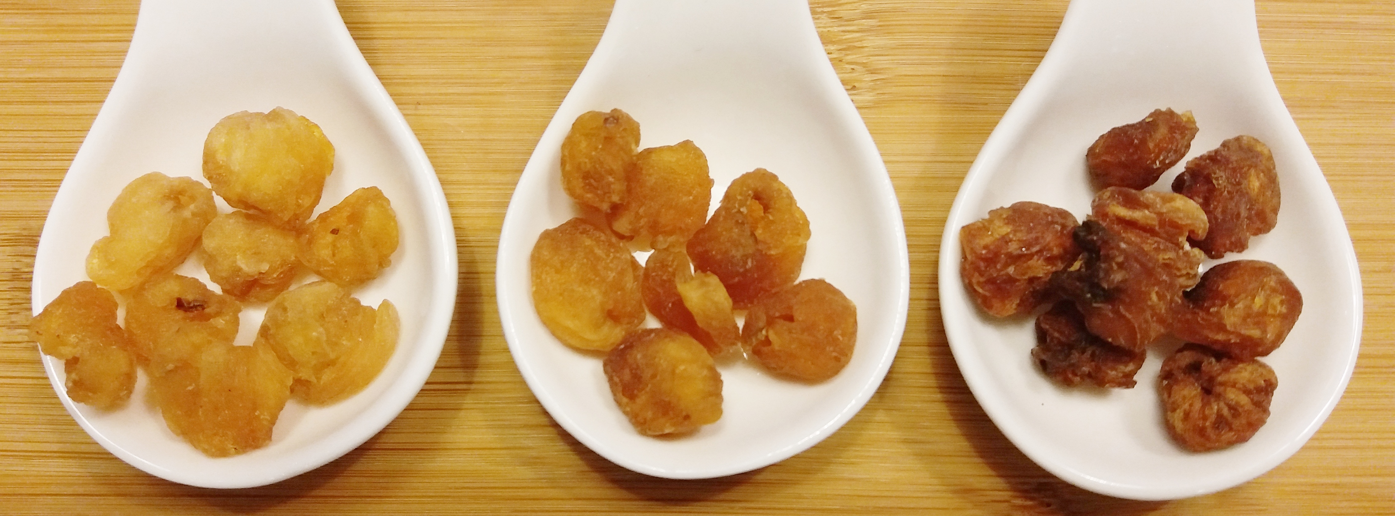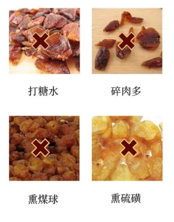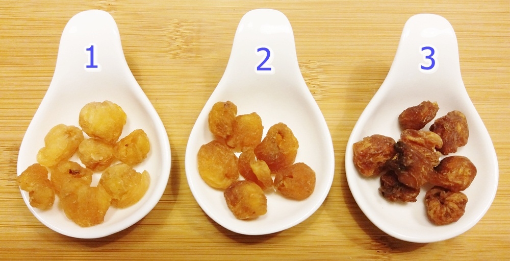 色︰靚桂圓肉顏色應該是黃褐色,色澤均勻有光澤, 表面有細微皺紋為佳 。色澤深黃色而透亮,表面沒有明顯光澤的桂圓肉有機會被煤球熏過;顏色整齊發白、透亮的桂圓肉則有機會被為硫磺熏過,亦長期不會變色。