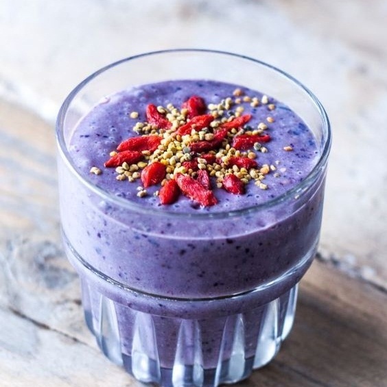2. 用攪拌機把士多啤梨及藍莓攪碎,加入桑椹子,杞子連浸泡的水一起再攪拌3秒便可飲用。